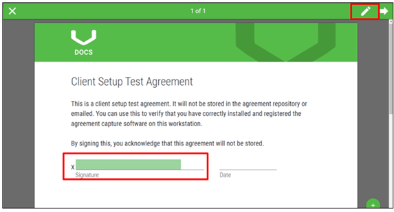 3. A test agreement will launch in Document Signing mode. The Signature point will be highlighted with a green box – manually select it, or tap the Signature icon, to open its Signature Capture panel.