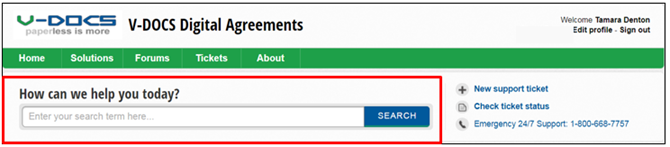 A Search feature appears on every page of the V-DOCS Support Helpdesk, allowing you to search the entire site for answers to FAQs, articles, help videos and documents, as well as for historical Support Tickets and content from the Forums tab (e.g. Announcements, Current SaaS Service notifications, etc.).